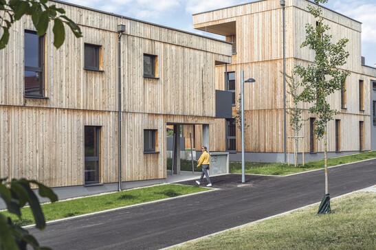 Die Wohnhäuser im Süden des Quartiers setzen voll und ganz auf umweltbewusstes Leben. Der Einsatz von Holz ist daher die logische Konsequenz. Bei den mehrgeschossigen Wohnbauten ist die Tragstruktur aus dem natürlichen Rohstoff Holz. Sichtbares Holz an den Decken sowie an einzelnen Wänden schaffen ein natürliches, beruhigtes und angenehmes Wohngefühl. Timbatec begleitete das Projekt als örtliche Bauaufsicht und steht dem Projektteam in statischen, bauphysikalischen und brandschutztechnischen Fragen zur Seite.