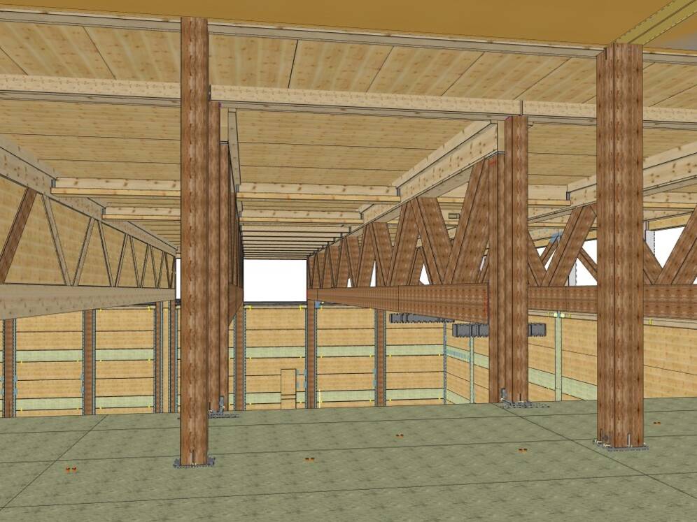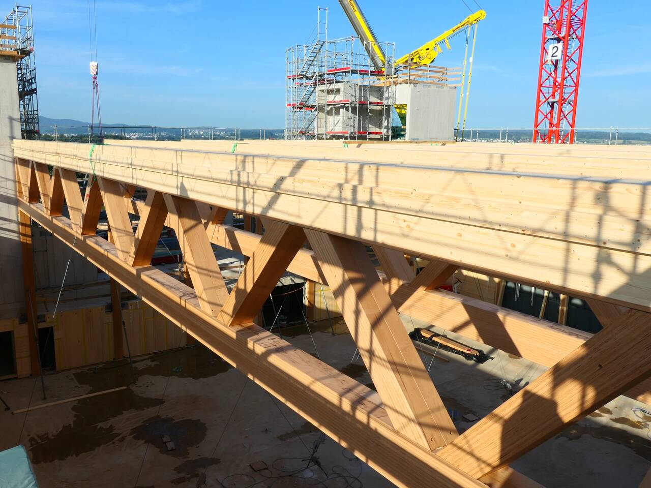 Beim Grossprojekt Schulensemble Neubau, Umbau und Instandsetzung 👉«Projekt Nägelimoos» in Kloten/ZH baute die Implenia Schweiz AG Holzbau imposante Fichte/Bau-Buche Fachwerke ein, welche über eine Länge von knapp 30 m die neue 2-fach Turnhallendecke überspannen. Die vorgefertigten Hightech-Holzbauteile haben eine Höhe von rund 3.20 m. Im Anschluss werden darauf auf zwei Geschossen weitere Holzelemente aufgesetzt, welche einen Mehrzweckraum mit Bühne und weitere Klassenzimmer mit Gruppenräumen ausbilden.