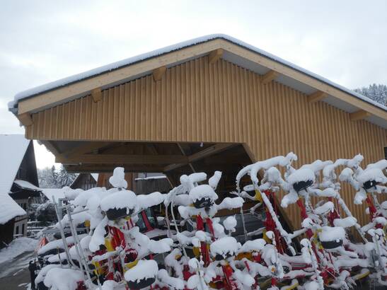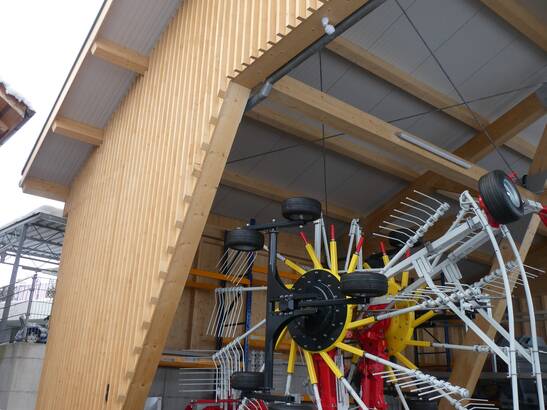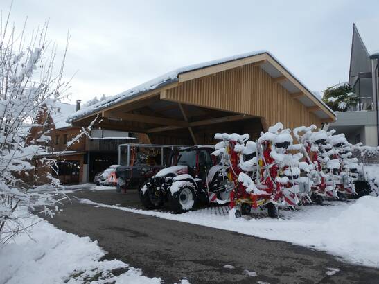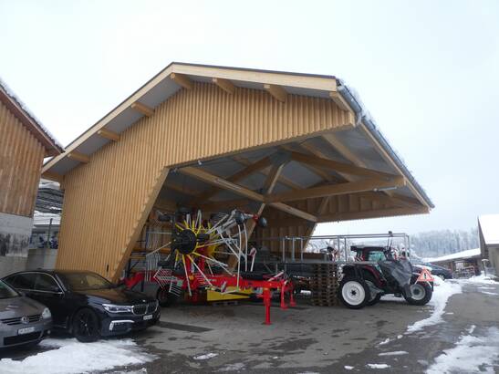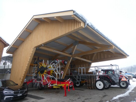 Die Trachsel Technik AG aus Mettmenstetten steht seit mehr als 30 Jahren für Kompetenz im Bereich Service, Verkauf und Reparatur von Landmaschinen. Um insbesondere dem stetig wachsenden Raumbedarf an witterungsgeschützter Fläche gerecht zu werden, wurde ein Holz-Unterstand mit einer möglichst reduzierten Anzahl an Stützen geschaffen.