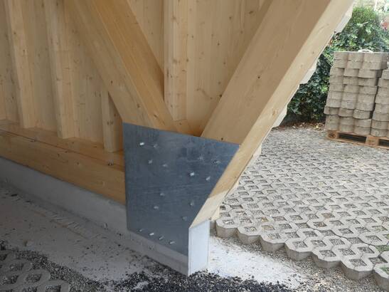 Die Planung und Umsetzung dieses Ingenieurholzbaus setzte eine enge Zusammenarbeit zwischen Architekten, Bauingenieuren und Handwerkern voraus, um die Gewissheit zu haben, dass die technischen Anforderungen an das Bauwerk jederzeit genügen. Insbesondere die Verankerungen in die Fundamente wurden mit höchster Präzision durchgeführt, um die Stabilität und Sicherheit des Unterstands zu gewährleisten.