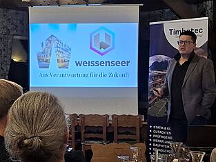 Nils Jansen von Weissenseer Holz-System-Bau zeigte anschliessend drei aktuelle Projekte. Besonders ausführlich ging er auf die Detailplanung und Montage im LeopoldQuartier ein und schilderte, wo Schnittstellen haken – und wie man sie besser löst. Die offene Diskussionsrunde im Anschluss zeigte, wie gross der Bedarf an einem gemeinsamen Verständnis zwischen Planung und Ausführung ist.