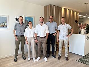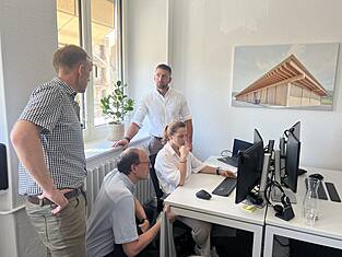 (v.l.n.r) Lukas Rüegsegger (Vorsitz Standortleitung Bern), Laura Lips (Holzbauingenieurin), Simon Vuilleumier (Vorsitz Standortleitung Lausanne) Andreas Burgherr (Vorsitz Geschäftsleitung), Johann Maître (Vorsitz Standortleitung Delémont)