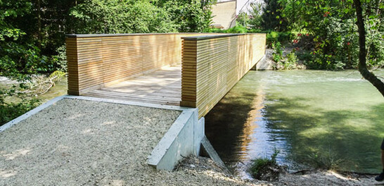 Die neue Brücke hatte aufs Fundament der ursprünglichen Querung zu passen, die Auflagesituation der Widerlager musste folglich übernommen werden. Die neue Brücke wurde als Trogbrücke konstruiert. Das Primärtragwerk besteht aus zwei Brettschichtholzträgern. Die Querträger aus Stahl sind mit den Primärträgern von unten mit eingeklebten Gewindestangen befestigt. Dank dieser biegesteifen Verbindung wird der Primärträger stabilisiert und kann nicht kippen. Die Längsträger der Fahrbahn bestehen aus Lärchenbrettschichtholz, der Belag aus Eichenholz. Bei der neuen Brücke hat es mehr Raum zwischen Wasser und Brücke als bisher – bei Hochwasser ein Vorteil. Bisher bestand die Gefahr, dass sich Treibholz aufstaut, die Brücke beschädigt und das angrenzende Land überflutet wird.