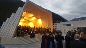 In Kirchdorf ist der Musikpavillon der letzte Baustein des neuen Bildungscampus. Er ist ein frei stehender und von allen Seiten sichtbarer Solitär mit der Bühne nach Süden und einer Bushaltestelle für den Schülerbus nach Norden.Das Faltwerk aus massiven Holzplatten wurde aus seinen akustischen Erfordernissen heraus entwickelt. Der Schall soll einerseits zum Publikum geleitet werden, andererseits müssen sich die Musiker gegenseitig hören, um zusammen spielen zu können.
