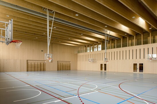 Die Konstruktion ist als tragende Holzstruktur konzipiert, die auf einem modularen Raster basiert. Die konstruktive Struktur, die Schalldämmung und die Beleuchtung verbinden sich zu einer warmen und ruhigen Atmosphäre, die perfekt für den Schulalltag geeignet ist.