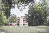 deDeutschDer neue Baukörper für die Alterswohnungen wird als solitäre Doppelvilla im Park verstanden, die von der Baumpflanzung umspühlt wird. Die gestaffelte Figur nimmt Rücksicht auf den Baumbestand und lässt den grossen Parkbäumen ausreichend Platz. Der Versatz des Volumens verzahnt die ortsbaulichen Achsen der Nachbarsbauten - Wohnbau im Norden, Altersheim im Süden – und reiht sich in in seiner Grösse in die Bahngeleise begleitende Bebauung ein. Sechs Wohnungen formen als Verteil- und Begegnungsraum eine zentrale Mitte als Herzstück des Hauses: man trifft sich, hier sind geschossweise Waschräume, ein Gästezimmer, eine Gemeinschaftsküche, und zumietbare Flexräume angegliedert. Der Grundtyp der Wohnungen basiert auf einer 3.5 Zimmer Wohnung. Die Wohnung verfügt über keine Erschliessungsflächen.