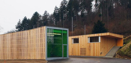 Einfache Stützen und einfache, zum Teil doppelte Hauptträger in Querrichtung – darüber Sparrenpfetten. Das Verwaltungsgebäude wurde als Holzrahmenbau mit sichtbaren Brettstapeldecken erstellt. Die Wände bestehen auch zum Teil aus innen sichtbaren Brettstapeln. Darauf wurde eine hinterlüftete Schalung montiert.