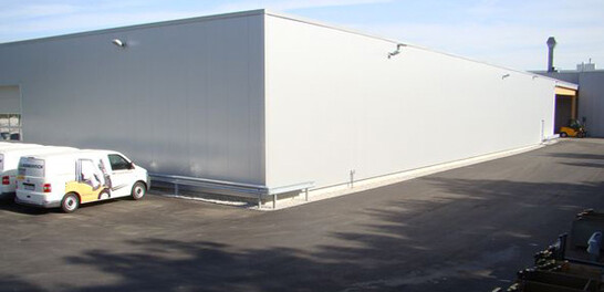 Als Hauptträger wurden Zwillingsträger aus Brettschichtholz gewählt, die Trägerdimension betrug 880 x 220 mm. Das Nebentragwerk bestand aus Rippenplatten, die Rippen aus BSH wurden überhöht geleimt, Rippendimension 320/80 mm, Dicke der Dreischichtplatten 42 mm. Die Windaussteifung erfolgte über Swiss-Gewi Stangen, die diagonal angeordnet wurden, wobei die Lasten direkt in die Fundamente eingeleitet wurden. Als Aussenwandverkleidung wurden Sandwich-Platten (d= 100mm) verwendet.
