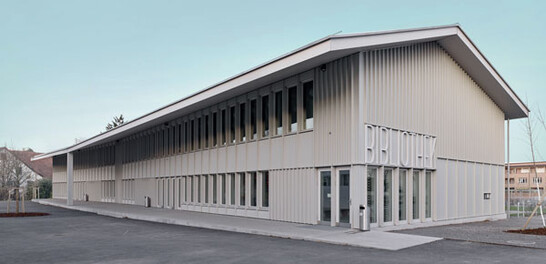 Der Neubau besteht aus zwei Geschossen und beherbergt sechs Grundstufenzimmer. Die Gemeindebibliothek im Obergeschoss hat einen separaten Eingang.