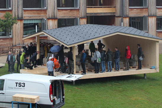 La société Timber Structures 3.0 AG a inauguré hier soir à la Haute école spécialisée bernoise HESB a inauguré le nouveau banc d'essai d'endurance TS3. Une centaine de personnes ont assisté à l'inauguration. Elles ont assisté en direct au collage frontal d'éléments de construction en bois par les spécialistes TS3.