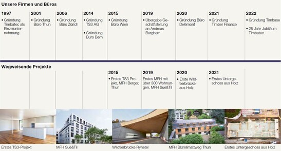 Au printemps 1997, Stefan Zöllig a fondé à Steffisburg la société Timbatec en tant qu'entreprise individuelle. Vingt-cinq ans après sa création, nous sommes devenus un bureau d'ingénieurs en construction bois de premier plan, employant 60 personnes sur cinq sites à Thoune, Berne, Zurich, Delémont et Vienne. La croissance a été particulièrement forte au cours des trois dernières années - les effectifs ont presque doublé.