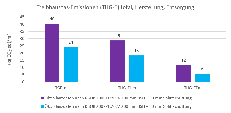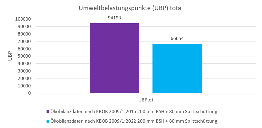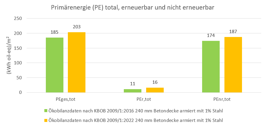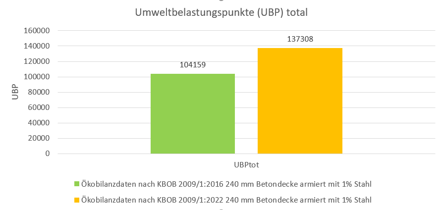 Avec les anciennes données on a calculé une dalle en béton d'un mètre carré, de 240 millimètres d'épaisseur, avec une d'armature de 1%, c'est-à-dire une exécution courante et fréquente de murs de soutènement. d'étages bétonnés, était chiffrée à 104'159 points de charge environnementale. Nouveau ce chiffre est passé à 137'308, soit une augmentation de 32%. La situation est similaire pour les l'énergie primaire et les émissions de gaz à effet de serre - et le béton est un puits de CO₂. béton n'est pas.