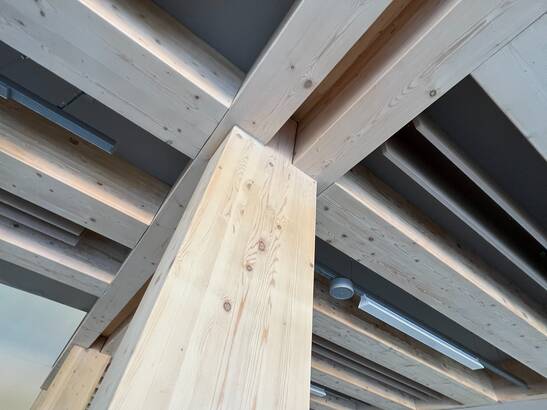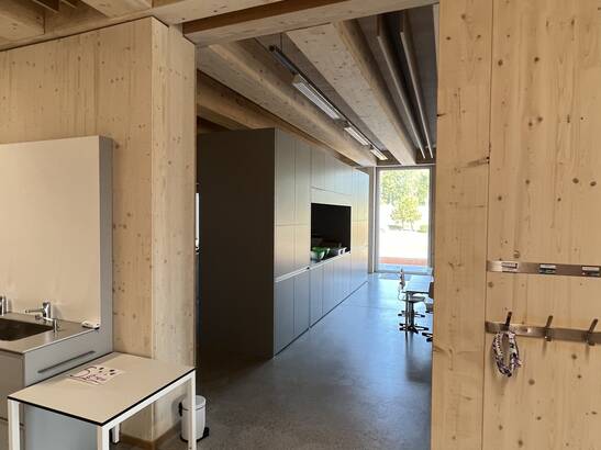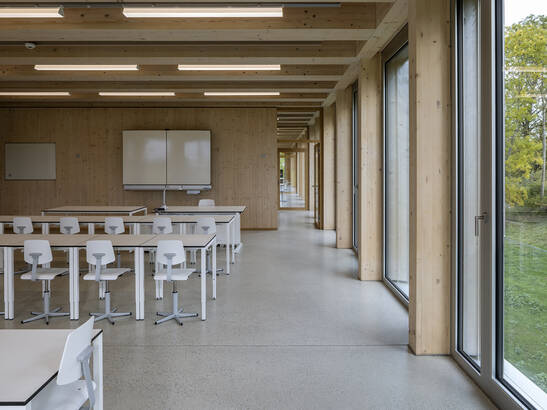 La nouvelle école combine la construction en bois massif et la construction à ossature habilement : Tous les planchers et une partie des murs intérieurs pour le contreventement du bâtiment sont construits en bois massif de bois lamellé-collé. Les autres murs intérieurs sont des cadres non porteurs. constructions à ossature. Les surfaces chaudes des murs et des plafonds en bois, ainsi que le l'échange permanent entre le bois et l'humidité de l'air créent un bon climat intérieur. climat intérieur. Des murs bien isolés sont importants : en effet, plus la différence entre la température de surface des murs, des sols et des plafonds et celle de l'air ambiant. température de l'air, plus il fait bon vivre dans une pièce. C'est pourquoi nous nous sentons dans les bâtiments en bois bien isolés, même lorsque la température est un peu plus basse. température ambiante. Les bâtiments peuvent ainsi être exploités de manière plus économe en énergie. De plus, la température Le bois donne l'impression d'avoir une température de surface plus élevée que le béton, l'acier ou le verre, ce qui Le bien-être est encore plus grand.
