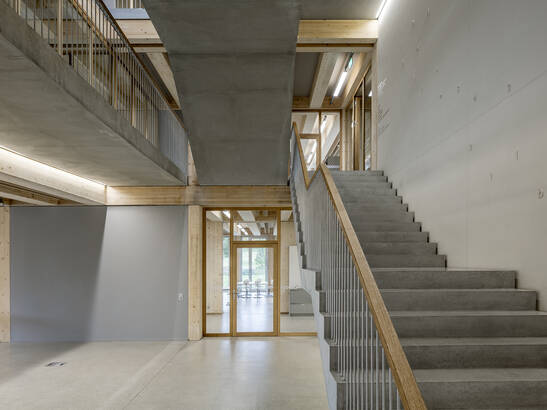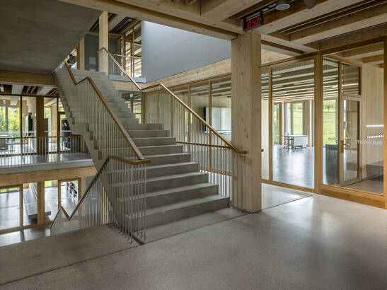 Pour l'école de Prêles, le choix s'est porté sur l'utilisation directe du bois. utilisation de son propre bois a été choisie. Les épicéas qui poussaient autrefois sur le plateau de Diesse ont poussé, sont aujourd'hui les piliers, les poutres, les murs et les plafonds de la nouvelle école. Le bois d'épicéa pousse rapidement et possède de bonnes propriétés de bois pour la construction de bâtiments. Sur endroits choisis, on utilise aussi du bois de hêtre. Par exemple comme support de l'escalier escalier de 13 tonnes au milieu du bâtiment scolaire. Il a été livré sous forme d'élément en béton préfabriqué. livré sur le chantier et monté sur les poutres en hêtre.