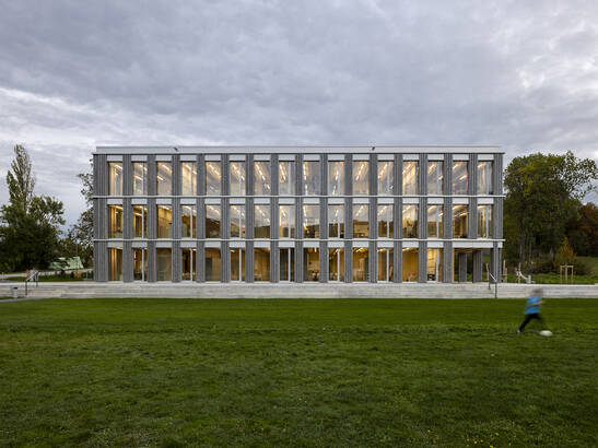 Ce projet montre de manière impressionnante que les bâtiments éducatifs peuvent aujourd'hui être construits en bois sans compromis. "De l'arbre au bâtiment scolaire", tel est le titre de travail qui a servi de base à la réalisation d'un reportage sur ce projet. Le film montre le déroulement de la sélection des arbres dans la forêt communale, l'abattage et le transport, le traitement industriel et la fabrication, les travaux de construction en bois sur le chantier jusqu'à la construction du bâtiment fini.
