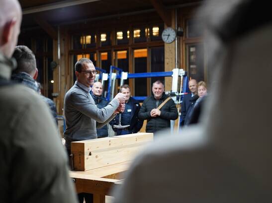 Le programme était placé sous le signe de la motion lancée en 2021 «Recherche et innovation du matériau bois pour l'utilisation dans la construction d'infrastructures en tant que contribution à la décarbonisation». Dans le cadre de la visite, les collaborateurs de l'OIC et de l'Office des ponts et chaussées ont eu un aperçu des compétences de la Haute école spécialisée bernoise en matière de recherche sur le bois et du grand potentiel de la motion pour la neutralité climatique de la Suisse.