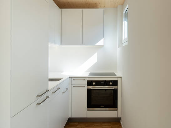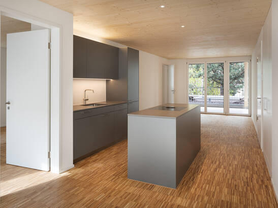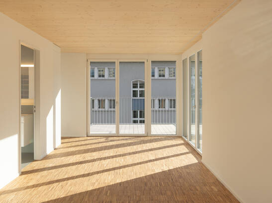 Pour la construction des plafonds des étages, on a choisi des éléments de caisson creux avec un remplissage de spilts et de la laine minérale dans l'élément de plafond. Ces plafonds en bois restent visibles dans les appartements et confèrent aux pièces une atmosphère agréablement confortable. La construction donne également de très bons résultats sur le plan acoustique.