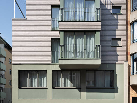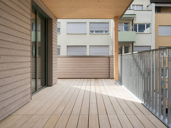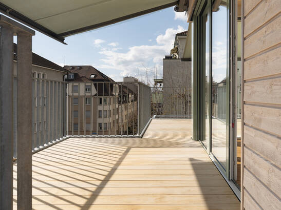 Le bois s'est imposé comme matériau de construction non seulement pour ses avantages écologiques, mais aussi pour sa légèreté. Comme nous venons de l'évoquer, la construction en bois devait se montrer à l'extérieur dans le contexte urbain et être lisible afin de rendre visible l'histoire de la construction du bâtiment. C'est pourquoi le bois a été utilisé à l'extérieur comme matériau de façade et pour les revêtements de sol des terrasses et des balcons.