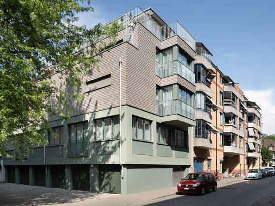 Reconnaître les qualités des bâtiments existants et continuer à construire sur cette base est une tâche importante de l'architecture. L'urbanisation vers l'intérieur présente plusieurs avantages : elle met un terme à l'étalement urbain et permet d'économiser de l'énergie grise, car moins de nouveaux matériaux de construction sont nécessaires. Du point de vue énergétique, les constructions bien rénovées sont souvent comparables aux nouvelles constructions et satisfont les besoins des utilisateurs. La surélévation au Giessliweg à Bâle est un bon exemple de densification interne.