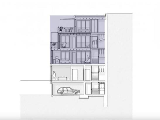 Sur la base d'une étude de potentiel et de faisabilité, le maître d'ouvrage a formulé le souhait d'exploiter au maximum les réserves d'utilisation de sa parcelle. La solution la plus prometteuse consistait à conserver le bâtiment existant de deux étages abritant le garage et l'atelier et à le surélever.