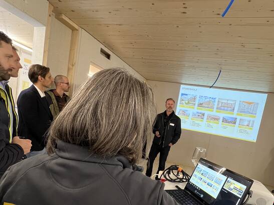 Le nouveau bâtiment «Scherli», construit en bois durable et selon les normes Minergie-P, convainc tant sur le plan esthétique que fonctionnel. Les visites guidées du bâtiment et les mots de bienvenue de Michael Leuenberger ont été suivis d'exposés introductifs des architectes (Adrian Habegger et Andy Plüss), du bureau d'ingénieurs en construction bois (Philipp Lutz et Lukas Rüegsegger) et de l'entreprise de construction bois (Nik Stuber).