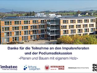 «Celui qui construit avec son propre bois obtient un bâtiment avec une plus-value et se crée en même temps un lien émotionnel avec sa propre matière première». Des exposés introductifs et une table ronde ont eu lieu sur le thème «Planifier et construire avec son propre bois» dans le «Esslinger Loogarten», un bâtiment de deux étages récemment surélevé.