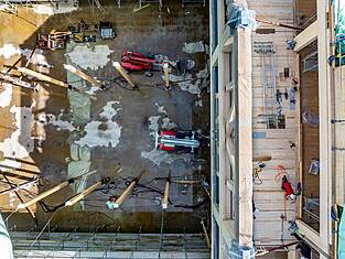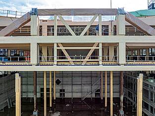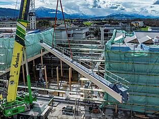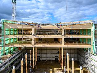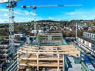 Le bâtiment principal Est mesure 97 mètres de long et environ 35 mètres de large. Actuellement, les programmes des bâtiments sont en cours d'érection. Les deux sous-sols en béton armé abritent les installations techniques, une salle de sport et le parking souterrain. Au-dessus, trois étages en bois sont destinés aux activités scolaires. Au-dessus du gymnase triple, une structure en treillis de deux étages (primaire et secondaire) servira de structure porteuse et sera, de par sa forme, l'une des plus grandes structures en treillis en bois jamais construites en Suisse. Longueur : 33,36 m, hauteur : environ 8 m. Des forces allant jusqu'à 1300 tonnes s'exercent sur la diagonale du treillis. Les équipes de professionnels de la construction en bois de BISANG Holzbau AG et de Kost Holzbau und Gesamtbau ont transformé plus de 2'500 m³ de bois en seulement six mois. En plus de la haute technologie de la construction, il s'agit d'un engagement fort en faveur de la construction durable en bois. C'est ainsi que fonctionne la protection active du climat.