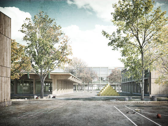 Le projet gagnant «Domino» du bureau d'architectes PENZISBETTINI. Architekten ETH/SIA GmbH, Zurich, se compose de quatre bâtiments. Le bâtiment principal, la maison Est, abrite les salles de classe des niveaux secondaires I et II ainsi que la salle de gymnastique triple. La maison Ouest comprend les jardins d'enfants et le premier cycle. La maison Nord comprend l'aula, la bibliothèque et l'informatique, tandis que la maison Sud abrite l'accueil parascolaire et le logement du concierge.