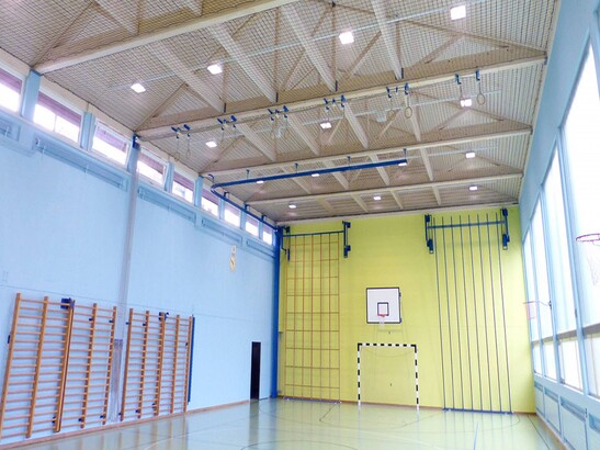 Comme le gymnase est directement adjacent à la maison communale, son aspect extérieur ne devait pas être modifié. La nouvelle structure porteuse a été construite avec des poutres en treillis qui couvrent la largeur du gymnase à une distance de 4,5 mètres.