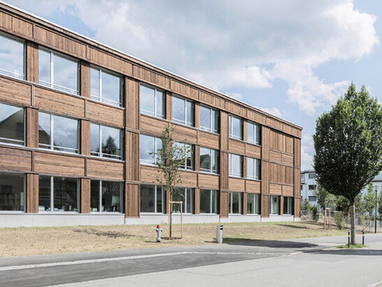 Le complexe scolaire Chrüzacher a été réalisé en construction hybride avec des plafonds en béton et des murs extérieurs porteurs en ossature bois. Le gymnase, d'une surface de 950 m², a été entièrement construit en bois au-dessus du sol. Les poutres du hall, en bois lamellé collé en bloc, de 360 x 1810 mm, s'étendent sur 28 mètres. Elles ont été surélevées de 10 cm afin de compenser directement les déformations dues aux charges propres et aux surcharges. A l'origine, le gymnase devait être couvert d'un toit en béton, mais sur proposition de Timbatec, on a opté pour un toit en bois composé d'éléments en caisson creux, ce qui a permis de réduire les coûts.