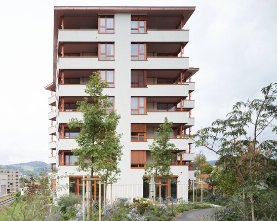 Les étages du socle sont construits en dur. Les étages situés au-dessus sont également construits en dur, à l'exception du mur extérieur porteur. L'enveloppe extérieure du bâtiment est constituée d'éléments en bois. Ceux-ci ont été érigés en même temps que la construction massive, étage par étage, et supportent statiquement les charges de la dalle en béton et servent également de coffrage frontal pour les dalles en béton. Cela permet de gagner du temps et de réduire les coûts liés aux échafaudages.