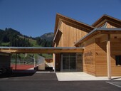 La membrure inférieure est constituée d'un tube d'acier (ROR 193,7 x 8), les entretoises (ROR 114,3 x 16) également. Pour la membrure supérieure (2 x 19 / 56 cm) et les poteaux (22 x 40 cm), on a choisi du bois lamellé-collé. Les "chevrons" (220 / 400) sont également en bois lamellé-collé. La surface du toit inclinée à 20° transmet environ 20% des forces de cisaillement et est donc pourvue d'une vitre clouée sur toute sa surface en OSB 22 mm. Ainsi, le contreventement horizontal des fermes en treillis est également résolu. Une grande attention a été accordée à la construction adaptée au chantier de la transmission des forces. Le côté ouest du hall a été réalisé en ossature bois, les poutres de toit étant respectivement posées sur des piliers en béton armé. Les murs des côtés nord et sud sont réalisés en ossature bois, le mur est en béton armé. La couverture est constituée de plaques d'Eternit de grand format ventilées par l'arrière. L'aile d'entrée (foyer, vestiaires et salle polyvalente) est également réalisée en bois. La structure porteuse du toit se compose de poteaux et de poutres transversales ainsi que de la couche de planches optiholz acoustiquement efficace qui les recouvre. Le toit au-dessus de l'aile d'entrée est végétalisé de manière extensive sur une isolation compacte.