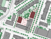 frFrançaisLe projet Est-Ouest complète les bâtiments existants par deux corps de bâtiments parallèles, presque identiques, qui ne se distinguent que par leurs étages. L'espace de la cour des pompiers est ainsi relié à l'espace extérieur vert de l'immeuble d'habitation voisin. Entre les deux terrains, le long de la clôture, l'équipe de travail propose un filtre de chênes colonnaires nouvellement plantés, sous lesquels se trouve une grande partie des places de stationnement pour vélos non couvertes. L'accès à la cour se fait naturellement de l'est et de l'ouest par des allées entre les bâtiments existants et les nouveaux bâtiments et le long de la limite de propriété au nord.
