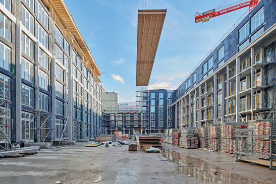 However, the timber construction is convincing not primarily because of its size, but because of the innovation in the construction process implemented by Timbatec. With projects of this size, builders normally first pour the concrete core of the staircase. the staircase core first, followed by carpenters assembling the prefabricated wooden wooden components. Timbatec has reversed this sequence: the timber structure is erected first and serves erected first and serves as permanent formwork for the liquid concrete. The reversal of the work steps is the logical consequence of today's working methods. Because: The timber builders calculate with smaller tolerances than the concrete builders.
