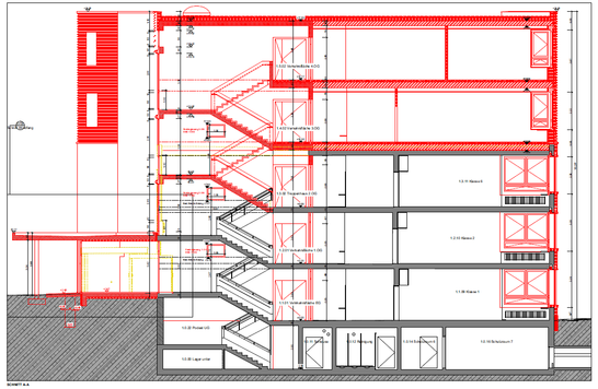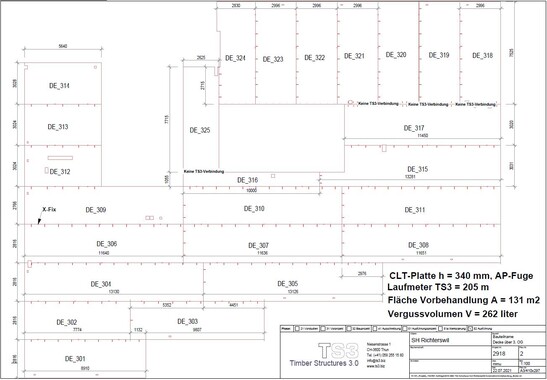 A 34 cm thick board barrier was installed on the existing roof of the school building. 34 cm thick cross laminated timber panel was installed as a load distribution panel. It enables a flexible room layout in the extension, independent of the existing load-bearing structure below, existing load-bearing structure. The two-story extension now stands on the storey extension now stands on it. The TS3 technology is used load distribution slab, the floor slab and the roof of the storey and the roof of the extension. Schilliger Holz AG delivered pre-treated plywood panels, which were grouted on site with a jointing resin to form large resin to form large homogeneous large-format panels. Depending on the floor, the panels have a thickness between 280 and 340 millimeters and are up to 13.5 meters long. A total of 540 meters of TS3 joints were created. Saxer Holzbau recently completed the erection work. completed.