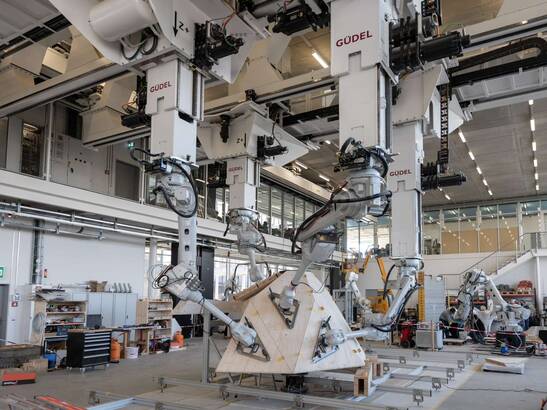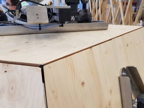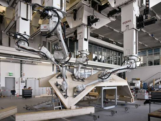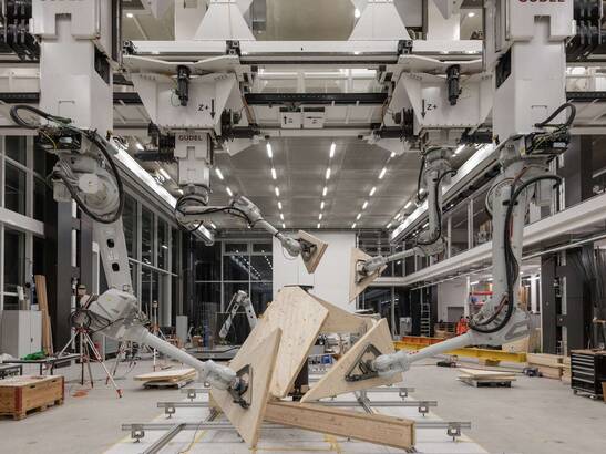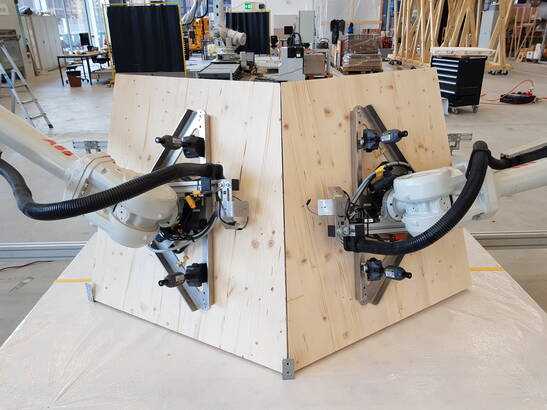 In contrast to traditional wood construction, robotic manufacturing has has several advantages: On the one hand, robots relieve humans of the heavy lifting and exact and exact positioning, and secondly, the assembly process can dispense with expensive, resource-intensive substructures can be dispensed with in the assembly process.