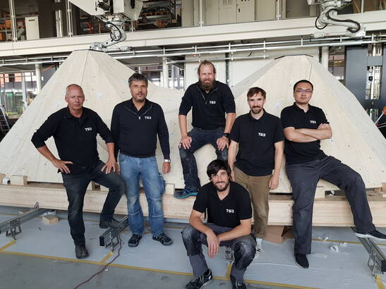 Four suspended robotic arms pick up the wooden panel assigned to them arms pick up the wooden panel assigned to them, perform a high-precision dance and then finally place the panels in the room according to the computer design. An algorithm calculates the movements of the robots in such a way that no collisions occur. collisions occur. Once the machines have placed their four panels are first temporarily joined together by craftsmen and craftswomen and then and then joined together with a TS3 casting resin. The cross laminated timber panels can thus be joined to each other on the face side by joint grouting without applying pressure. Timbatec developed this process in several research projects with the ETH Zurich and the Bern University of Applied Sciences. Today it is mainly used for the construction of Today, it is mainly used for the construction of floor slabs, but also enables structures such as Semiramis. Thus between 51 and 88 such wooden panels are joined together to form a wooden shell. are joined together.