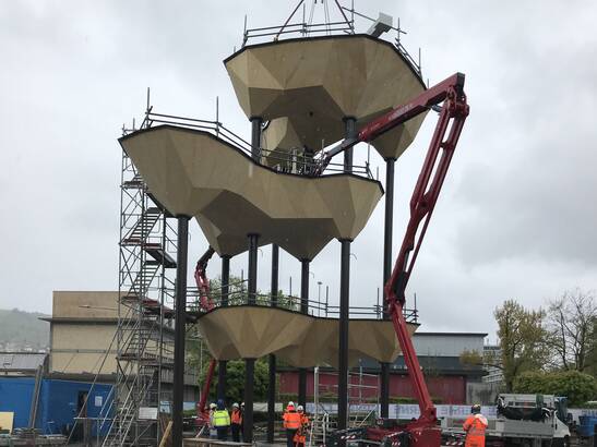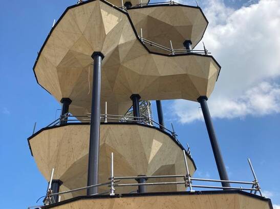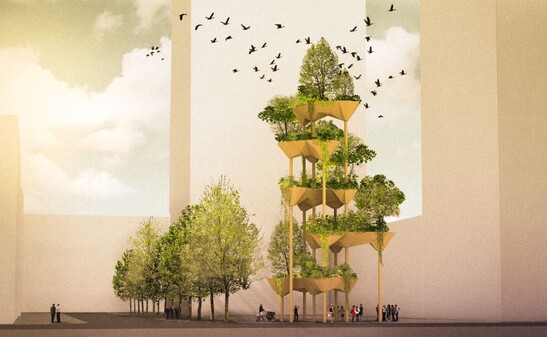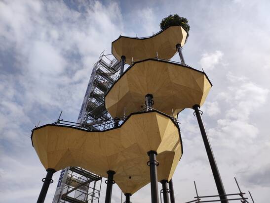 For the Tech Cluster Zug, researchers from ETH architecture professors Fabio Gramazio and Matthias Kohler, together with with Müller Illien Landscape Architects, Timbatec and other partners. partners are building a planted architectural sculpture. The 22.5 meter high structure consists of five geometrically complex wooden shells, which - slightly offset from each other slightly offset from each other - are supported by eight slender steel columns.
