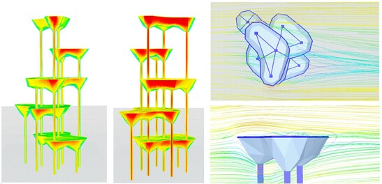 Robotic prefabrication is currently running at full speed. The individual formwork segments are constantly being transferred to trucks in and the architectural sculpture will then be erected and finally installed in spring 2022. and finally planted. From summer 2022, it will be possible to to view the wooden structure from the ground and the buildings, and to take a look into the greened shells. The slender and tall structure will be lushly planted with large bushes and trees and will thus have a stately dead weight. At the same time, it represents a large surface of attack for the wind . Thanks to the advantageous round shape of the shells, the wind is guided around the structure. around the construction. Nevertheless, the stiffening of the structure with the eight slender slender columns is a challenge. The wind pressures on the shell were calculated with calculated with a fluid mechanical RWIND simulation from Dlubal Software, which simulates the flow around the structure in a wind tunnel. In addition resonance effects along and across the wind direction had to be taken into wind direction had to be taken into account in the calculations.