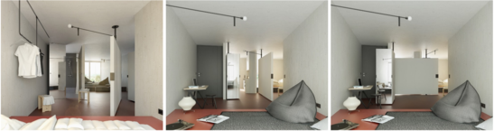 Movable components such as sliding walls, folding walls or revolving doors are not popular in architecture, as they require more construction work and are susceptible to faults. constructional effort and the components are susceptible to malfunctions. malfunctions. The mock-up at ETH Zurich served to develop prototypes of such movable elements and to prototype and to refine them constructively. More about moving components can be found in the report on the research work " vacancy - no vacancy " by the office of Edelaar Mosayebi Inderbitzin.