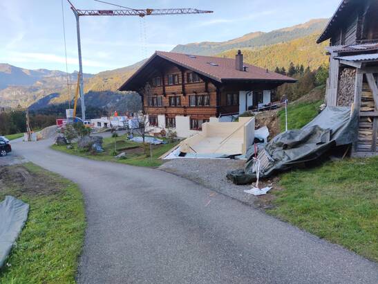 In the Geissholzli in the picturesque Bernese Oberland, the different epochs of timber construction meet. The home of the Maurer family from 1997 was built in log construction and shows the proven carpenter's art. This includes a good constructive wood protection with the large canopy. The wood on the facade ages evenly and has a beautiful patina. The constructions of walls and ceilings are protected from moisture and are built for eternity.
