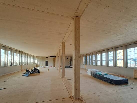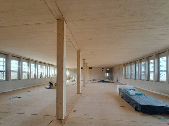 Timbatec has many years of experience in planning office buildings. Here we provide insights into recently realized office buildings and commercial properties. A current example is the multifunctional laboratory building on the Irchel campus of the University of Zurich. In addition to office, storage, technical and infrastructure rooms, the new building primarily provides highly installed laboratory space totaling 2,450 m². On top of the two-story solid structure, the three-story wooden building complex with 3.8 meter high rooms was recently completed.