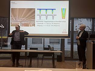 Andreas Burgherr presented the fundamentals of fire protection in Swiss timber construction: the fire behavior of wood, typical damage patterns, protection objectives, and verification concepts. The focus was on the systematic handling of fire loads, cavities, and structural solutions. The key is a robust construction method that enables predictable and controllable fire behavior.