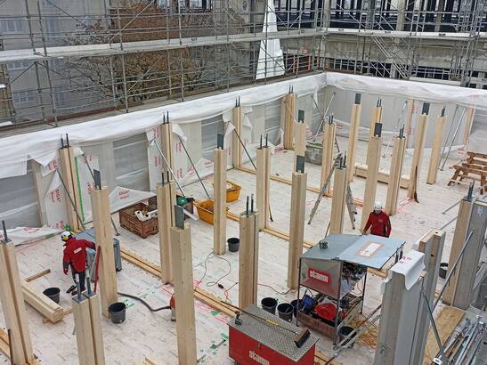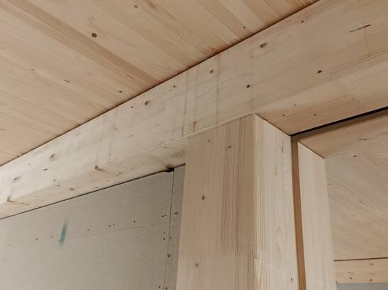 As a timber construction project, LysP8 meets high sustainability standards. A large number of well-preserved, used components are reused, including elements for the solid wood ceiling that once spanned the Formula E race track in Zurich, for example, as well as fermacell® gypsum fiber boards for the walls and corrugated sheets for the roof. Cork strips were applied to the wooden floor beams, which on the one hand functionally decouple and improve the impact and room sound, and on the other hand visually create a shadow gap on the ceiling (see pictures below). All reused materials make a valuable contribution to resource-saving construction.