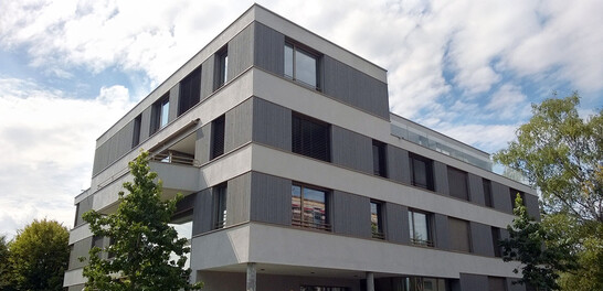 The load-bearing layer along the exterior walls is built in prefabricated timber construction, with individual load-bearing timber columns integrated into non-load-bearing timber frame walls. The entire attic floor was also constructed in timber.