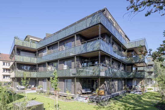 The two apartment buildings, each with 14 apartments, are purely wooden structures from the first floor slab upwards. The combination of polycrystalline photovoltaic modules on the balcony parapets and the horizontal wooden facade give the buildings a distinctive character.