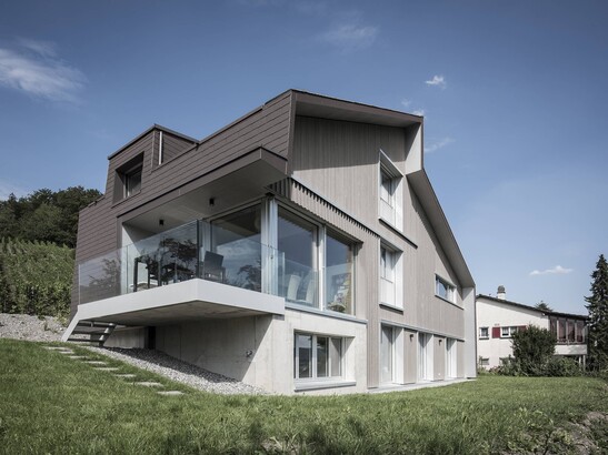 Another special feature of the house in Otelfingen is the special shape of the roof. On one side of the wooden building, the roof reaches all the way to the ground and thus becomes, so to speak, the - windowless - facade of the house. A large skylight and the generous window front at the living room, which allow daylight to flow into the house, ensure sufficient brightness inside.