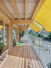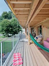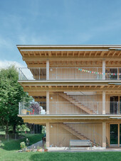 The client attaches great importance to regionality and the ecological choice of materials. It is therefore obvious that climate-damaging materials such as concrete and steel were minimized to a minimum in the Generation House. A total of 585 m3 of wood has been used in the building. This corresponds to a solid wood cube with an edge length of 8.4 meters. By comparison, the three-story house has a building height of 8.6 meters. This much wood grows in Switzerland in about 90 minutes. Thanks to photosynthesis, this wood stores 379 tons of CO2 which is now stored long-term in the Generation House.