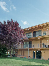 The columns run with Hinrnholzkontakt through the entire height of the building and allow a low-settlement construction. Pincer pairs run on the structural axes at slab level, functioning as beams. Timber-frame building stringers fan out the skeletal structure, shape the apartment floor plans, and serve as building bracing. An electrical biology network in building envelope and between dwelling units minimizes electrical radiations in the apartments.