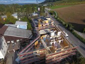 The exterior dimensions of the two multi-family buildings were adapted to the non-regular site layout. This results in irregular building footprints with sloping walls and recessed floors. The main challenge was the recessed attic floor, where the loads had to be transferred above the spacious living and dining area below. The loads could be transferred with the help of individual steel girders integrated in the floor slab.